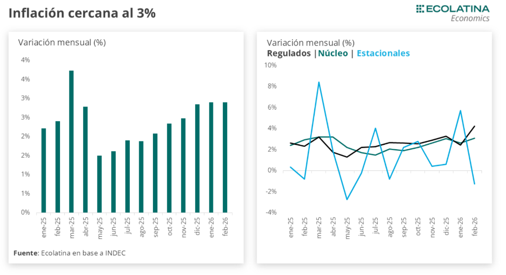 La inflación fue de 2,9% en febrero, igual que en enero, acumulando 5,9% en el primer bimestre y 33,1% interanual. El mayor aumento se registró en Vivienda, agua, electricidad y gas (+6,8%) por subas tarifarias, seguido por Alimentos y bebidas (+3,3%), impulsado por carnes. No obstante, el dato que más preocupa es que la inflación núcleo alcanzó el nivel más alto desde abril del año pasado (+3,1%). En línea con esto, solo la Canasta Básica Alimentaria (línea de indigencia) se ubicó por encima de la inflación del mes: aumentó 3,2% (-2,6 p.p. respecto al mes previo), mientras que la Canasta Básica Total (línea de pobreza) creció 2,7% (-1,2 p.p.), por debajo del nivel general de precios. Desde hace varios meses, ambas canastas acumulan incrementos superiores a la inflación.
