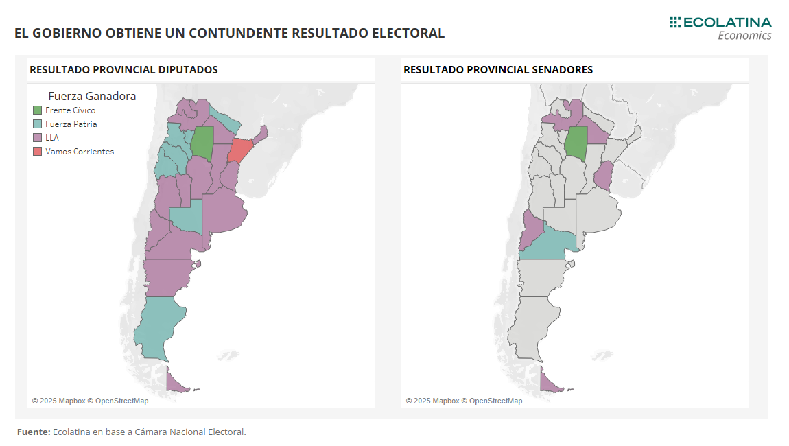 La provincia de Buenos Aires concentra un tercio de la producción agrícola nacional y es el bastión industrial del país, al aportar cerca del 50% del total de la producción manufacturera argentina. En PBA hay industria automotriz, siderúrgica, farmacéutica y agroindustria, además de producción agroganadera. Por lo tanto, la caída de la actividad industrial en el último tiempo fue particularmente relevante allí. En este sentido, el empleo privado registrado de la provincia se redujo en casi 40 mil puestos de trabajo desde el camio de Gobierno y su PBG cayó 3% en 2024. Esta dinámica puede haberse reflejado en las elecciones legislativas del domingo pasado, donde el triunfo de Fuerza Patria se concentró en el conurbano (es decir, las regiones más industriales), y LLA predominó al interior de la provincia.