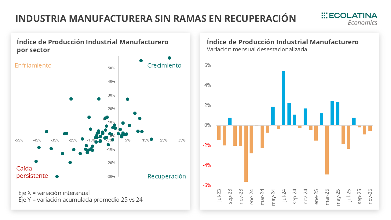 El Índice de Producción Industrial Manufacturero (IPI manufacturero) registró en noviembre una caída mensual desestacionalizada de 0,6%, acumulando tres meses consecutivos de bajas. En términos interanuales, la actividad industrial se contrajo 8,7%, mientras que en los primeros once meses de 2025 acumuló una caída de 5,5%. Con el dato de noviembre, la industria alcanzó un nuevo mínimo, ubicándose en el nivel más bajo desde la recuperación iniciada a mediados de 2024.