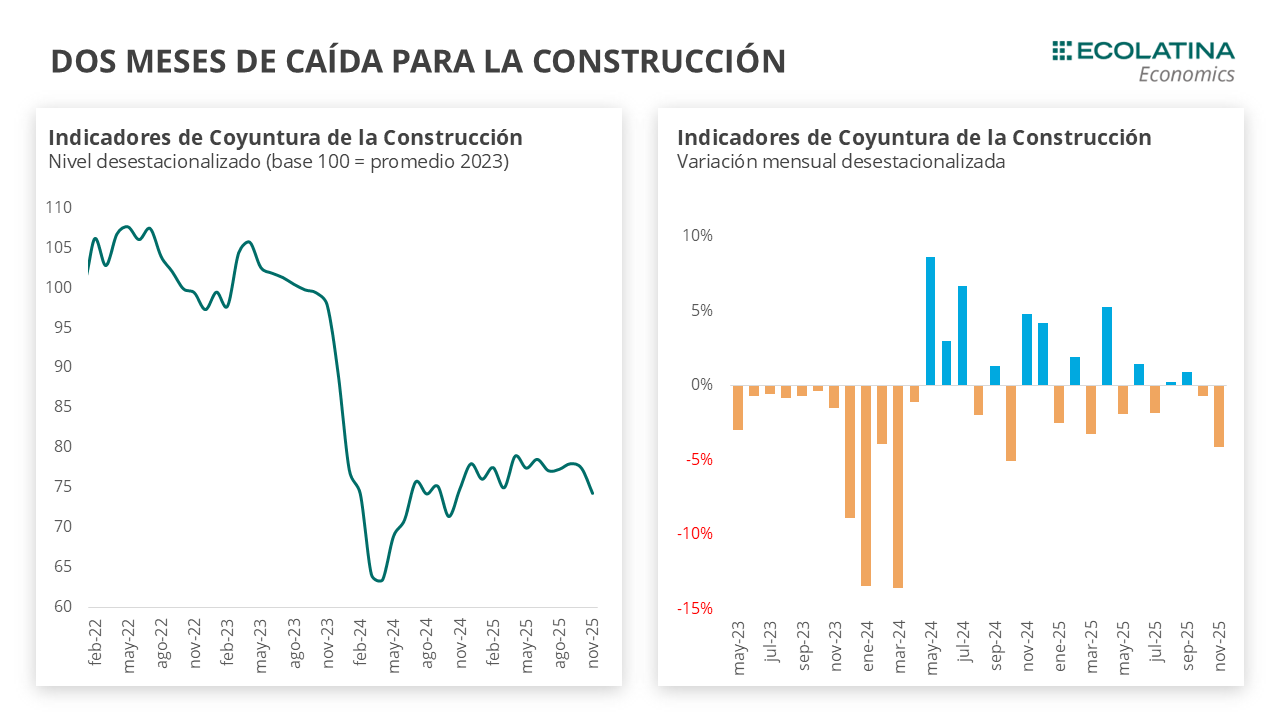 El Indicador Sintético de la Actividad de la Construcción (ISAC) cayó 4,1% en noviembre, tras haber retrocedido 0,7% en octubre. Con el desempeño de noviembre, se posicionó -4,7% i.a., y acumula una caída similar durante el año. Sin embargo, en el promedio del período está 6,6% por encima del mismo período del 2024, un año particularmente malo para la construcción.