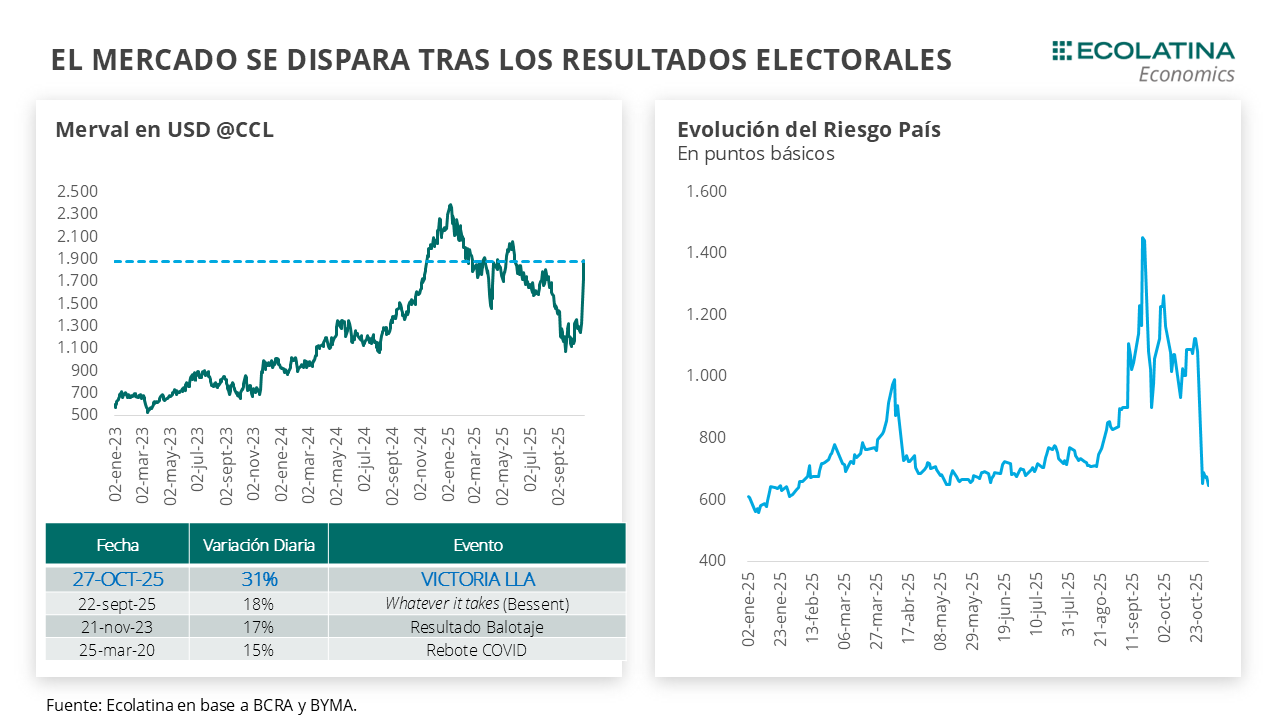 Quedó atrás un evento bisagra para el programa económico del Gobierno. El contundente y sorpresivo resultado electoral de la Libertad Avanza a nivel nacional y en especial la victoria en PBA tras el duro traspié de septiembre propició un optimismo en el mercado financiero sin precedentes. Durante el lunes post-electoral, el Merval se disparó 31% en dólares y se posicionó como la variación diaria más elevada de la historia, el precio promedio ponderado de los bonos Globales saltó 18% y el Riesgo País se comprimió 400 puntos básicos hasta la zona de los 600 p.b.
