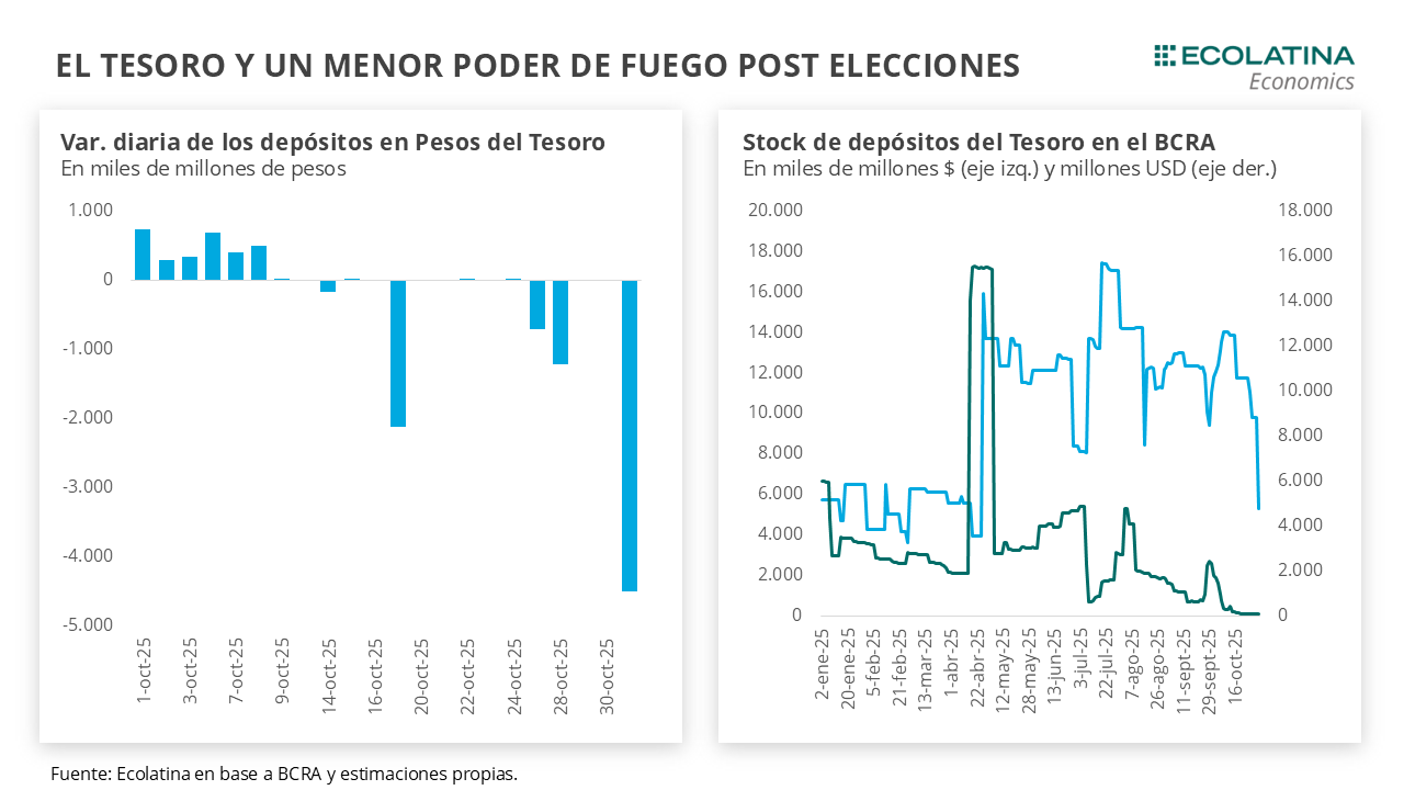Producto de ambas operaciones, el stock de depósitos del Tesoro en pesos llegaría al orden de los $5 bn. Naturalmente, esto pondrá el foco en la evolución de la cuenta en pesos de Finanzas, teniendo en cuenta que durante noviembre deberá afrontar vencimientos en moneda nacional por $27,8 bn y otros $39,3 bn en diciembre. A esto se le adhieren los vencimientos en USD, que sólo con el FMI alcanzan los USD 850 M (equivalentes a $1,2 bn) durante el próximo mes en el marco de depósitos en dólares de tan sólo USD 84 M, lo que impone una exigencia doble sobre los depósitos en pesos.