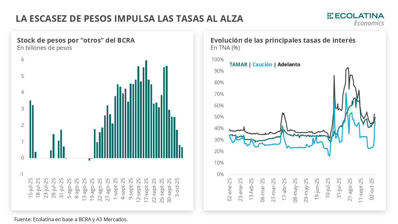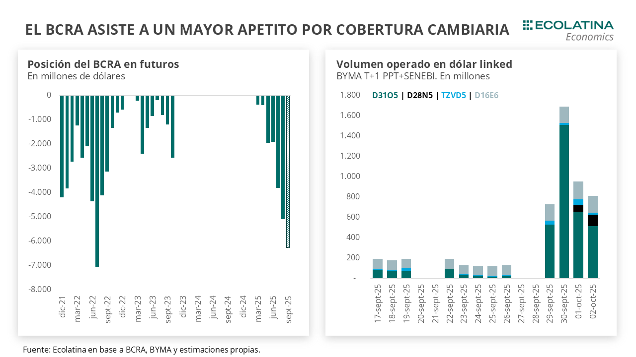 La ventana de liquidez llegó con la licitación de Finanzas. En un contexto de vencimientos reducidos ($3,9 bn), el rollover se ubicó apenas en el 45% y lo adjudicado ($1,7 bn) se concentró en instrumentos atados al dólar con un corte de TEA de 3% y 10%. Por su parte, los instrumentos de renta fija quedaron desiertos, con un Tesoro que prefirió no convalidar una tasa que se encontraba en línea con un mercado secundario rindiendo 8% TEM y se inclinó por oxigenar a los bancos (principales demandantes). Por ende, la licitación reflejó las condiciones de un mercado que demanda mayor cobertura cambiaria y un menor apetito por instrumentos denominados en pesos. Luego de la liquidación de hoy, las tasas de interés se comprimieron (similar a lo ocurrido a mediados de agosto): la tasa de REPOs pasó de un pico de 157% TNA PP al orden del 50% TNA hoy, y la caución de 100% TNA a 35% TNA.