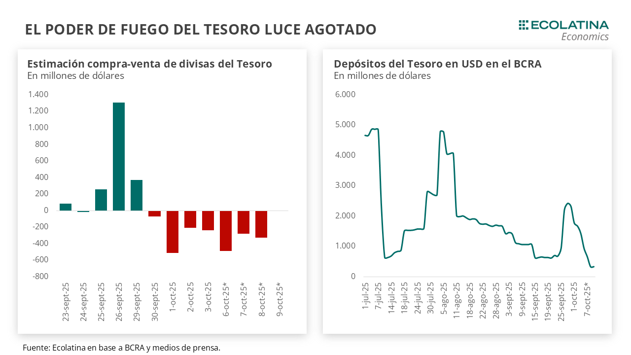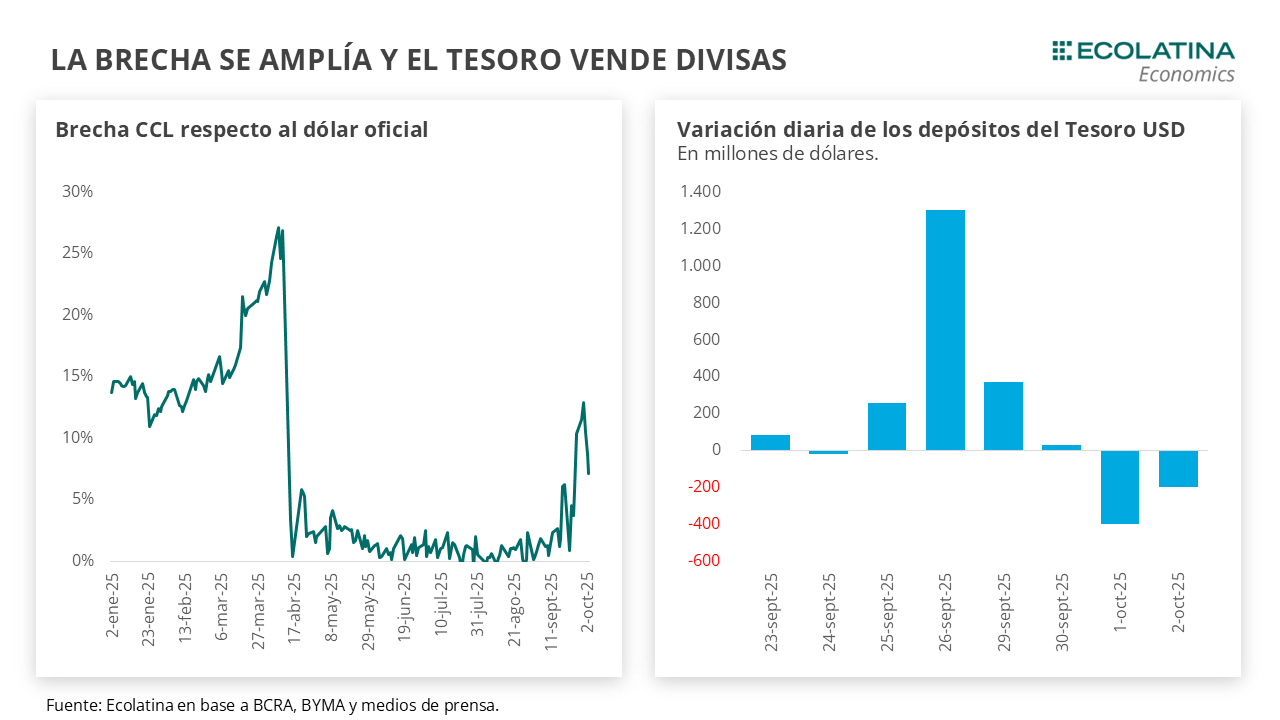 El efecto Bessent se esfumó tras la reunión de Javier Milei con Donald Trump el martes. El presidente de USA condicionó la ayuda externa a una victoria electoral por parte del oficialismo el próximo 26 de octubre. Con un resultado de PBA resonando y la baja del principal candidato a dicha provincia a dos semanas de las elecciones, el anuncio fue tomando con escepticismo por parte del mercado. A pesar de la profundización de la intervención del Tesoro de USA, persistió la volatilidad en los activos locales y el dólar oficial se deslizó al alza. En este sentido, las ventas no estarían siendo suficientes para contener las expectativas de devaluación, pero están permitiendo que el Gobierno gane tiempo, y ganar tiempo significa perder menos dólares.