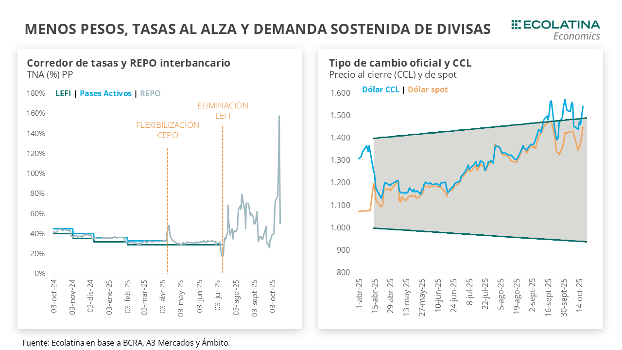 Tras las declaraciones, el pesimismo se sobrepuso a la intervención del Tesoro de USA. Desde el anuncio de Bessent de intervención directa en el MULC el jueves 9-oct hasta la reunión, el riesgo país se redujo 100 puntos básicos, los bonos subieron 8%, el Merval medido en dólares subió 16% y el tipo de cambio spot retrocedió $80 hasta los $1.350. No obstante, en la jornada de la reunión el riesgo país volvió a la zona de los 1.000 p.b., los bonos retrocedieron 5%, el Merval cayó 6% y el dólar spot se deslizó a los $1.400 a pesar de la venta de divisas del Tesoro de USA.