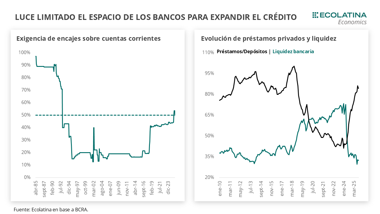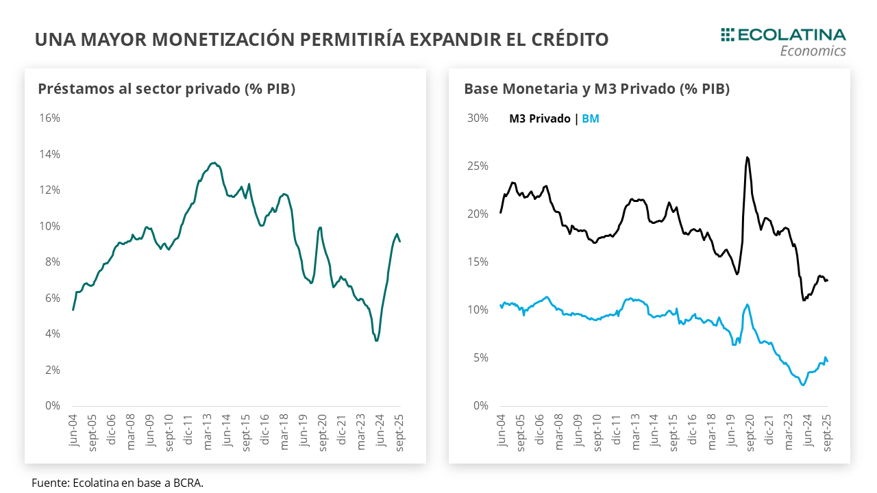 El plano monetario trajo novedades, con el BCRA relajando 3,5 p.p. los encajes y subiendo en igual medida la integración mediante títulos públicos. Producto de estos movimientos, Finanzas obtuvo un rollover del 96,5% en la semana. Asimismo, el Central redujo la integración mínima diaria del 95% al 75%, lo que aliviará las necesidades de liquidez de los bancos y reducirá la volatilidad reciente de las tasas de interés. Los menores encajes y una reducida monetización de la economía disparan la pregunta de cuánto más se puede expandir el crédito. En pocas palabras, una lenta normalización de la política monetaria permitiría una expansión adicional del crédito, pero un aumento mayor requerirá de fuentes adicionales de liquidez. Estás fuentes permiten pensar en un 2026 con un Central comprando dólares en el mercado y un Tesoro inyectando liquidez mediante las licitaciones.