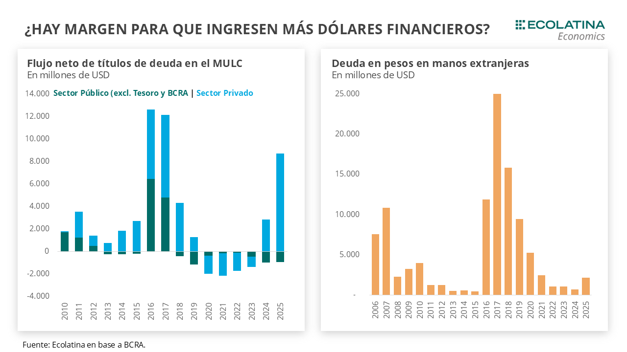 La medida apunta en dos direcciones. En primer lugar, a facilitar el rollover de Finanzas, que en la licitación de esta semana alcanzó el 96,5% tras adjudicar $14 bn sobre ofertas por $14,7 bn. Al interior, la LECAP/BONCAP con vencimiento hasta abril del 2026 acapararon cerca del 50% de lo adjudicado, con una tasa de corte por encima del mercado secundario; al tiempo que la letra TAMAR (M30A6) concentró el 20% fruto de la demanda de los bancos para integrar encajes bancarios vía títulos públicos (como vimos más arriba).