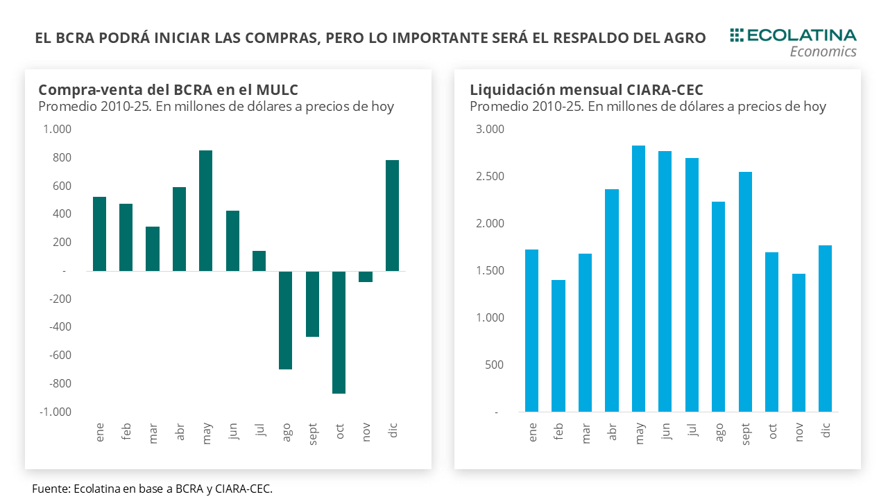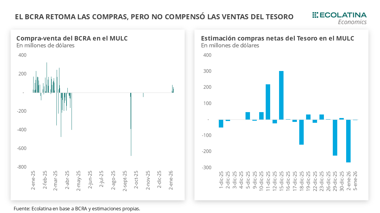 Mencionamos esto porque las compras del Central no compensaron las ventas del Tesoro. Venimos comentando que, desde el anuncio de la nueva Fase, el Tesoro revirtió la postura compradora que venía presentando en el MULC. Desde mediados de diciembre a finales de mes, estimamos que Hacienda vendió USD 336 M en el mercado, es decir, se desprendió de 6 de cada 10 dólares que supo comprar a comienzos del último mes del 2025. Estas ventas estuvieron concentradas la semana pasada, cuando se desprendió de USD 226 M el 29-dic y USD 266 M el 2-ene, cuando comenzaba a regir la nueva Fase (y el Central no compró).