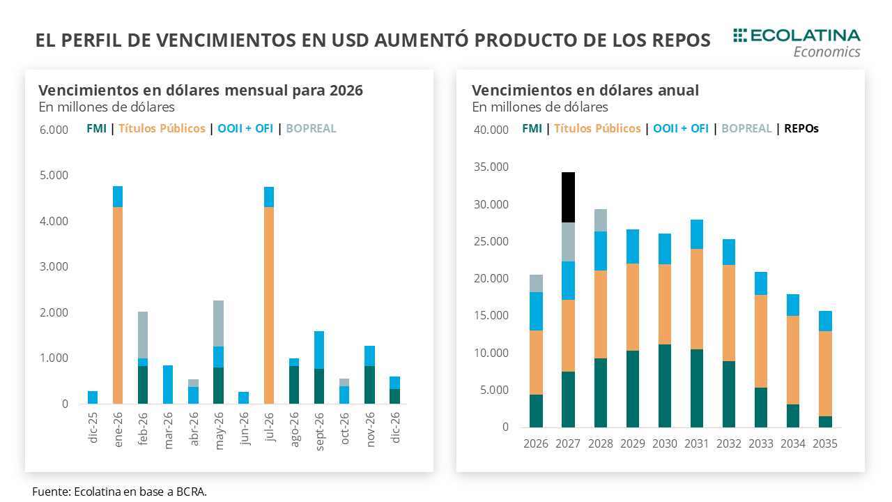 Estas operaciones impactarán en la medición de Reservas Netas. Para repasar, la medición de Reservas Netas descuenta a las Reservas Brutas los pasivos con vencimientos menores al año, buscando de esta forma medir la posición del BCRA para afrontar las obligaciones de corto plazo. Los diferentes REPOs concertados implican un aumento de los vencimientos de cara a 2027 por USD 6.700 M, que en poco tiempo comenzarán a computarse de pleno en la medición de las RIN (a hoy se descuenta un REPO por USD 1.000 M que surge de la información mensual de Reservas que envía el Central al FMI).