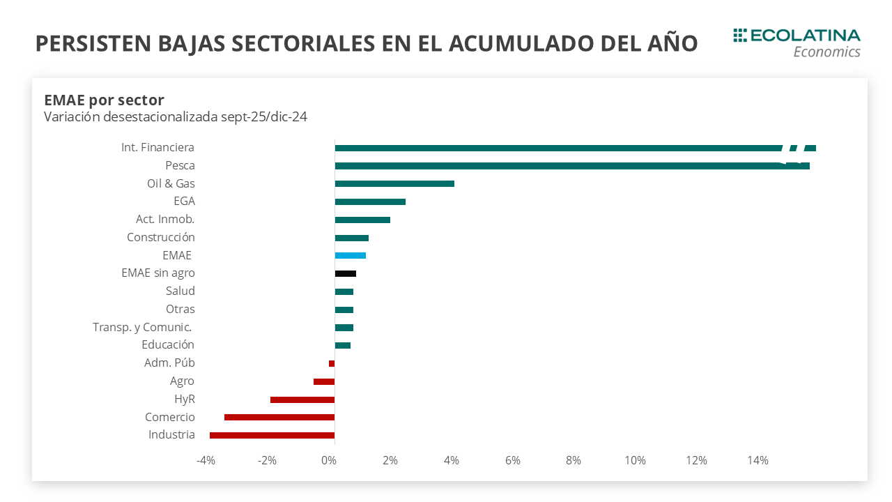 Además, la región es muy sensible a la caída de la demanda interna, ya que al aglomerar a los grandes centros urbanos del país -es hogar del 66% de la población-, tiene una estructura industrial y de servicios. Así fue como en 2024, todas las provincias de la región pampeana presentaron caídas, exceptuando Santa Fe y Entre Ríos que crecieron marginalmente.