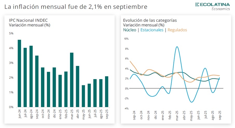 El IPC de INDEC volvió al 2%. En septiembre, el IPC Nacional alcanzó el 2,1% mensual, mostrando una aceleración de 0,2 p.p. respecto al mes anterior y la variación más elevada desde abril. De esta manera, la inflación acumula un crecimiento del 22,0% hasta septiembre y de 31,8% i.a. Respecto a las categorías, la inflación núcleo fue de 1,9%, mientras que los precios regulados subieron 2,6% (como consecuencia de aceleración en los incrementos de combustibles y electricidad y gas) y los precios estacionales un 2,2%. Con un tipo de cambio que aumentó 5,5% en el promedio de septiembre, los Servicios (+2,3% mensual; -0,2 p.p. respecto a agosto) continuaron desacelerando y, por el contrario, los Bienes (+2,0%; +0,4 p.p.) aceleraron por tercer mes consecutivo. A su vez, el INDEC anunció un cambio en la metodología de medición del IPC, con base en la Encuesta de Ingresos y Gastos de los Hogares 2017-2018, que comenzará a regir desde enero del 2026.
