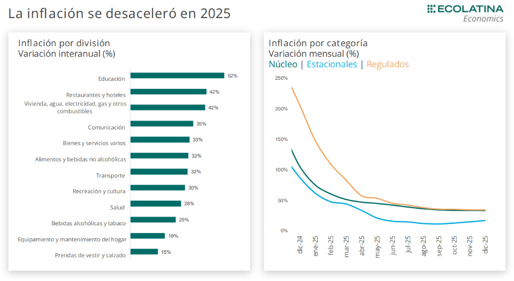 La persistencia de la caída de la actividad en el período posterior a las elecciones pone de manifiesto que el deterioro no respondió únicamente a un factor estrictamente coyuntural (como el proceso electoral de octubre), sino que refleja cambios profundos en la estructura productiva a nivel sectorial. Esto se debe a la estabilización macroeconómica y a la mayor apertura de importaciones. En este sentido, como viene ocurriendo mes a mes, vuelven a destacarse los sectores ganadores del modelo: la intermediación financiera (+13,9% i.a.), la agricultura (+10,5% i.a.) y la explotación de minas y canteras (+7,0% i.a.). En contraste, las principales caídas interanuales continúan concentrándose en la industria manufacturera (-8,2%), el comercio (-6,4%) y la construcción (-2,3%).