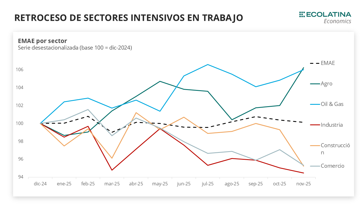 Esta divergencia sectorial también se refleja en el mercado de trabajo. Si bien los puestos de trabajo totales crecieron 2,0% i.a., el aumento se explicó por el fuerte crecimiento de los puestos no asalariados (+5,2%) y de los asalariados no registrados (+2,8%), mientras que el empleo asalariado registrado no mostró variación i.a. (0,0%). En la misma línea, las horas trabajadas de los asalariados registrados cayeron 1,7% i.a., frente a un aumento de 3,6% en las horas de los asalariados no registrados, lo que da cuenta de una recomposición del empleo hacia modalidades más precarias, coherente con una estructura productiva menos intensiva en empleo formal.