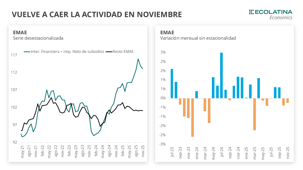 El Estimador Mensual de la Actividad Económica (EMAE) registró una caída del 0,3% s.e. en noviembre, siendo la segunda caída mensual consecutiva. A su vez, es la primera vez en catorce meses que presenta una variación interanual negativa (-0,3%). Excluyendo al agro, la caída hubiera sido del -1,7% i.a. De todos modos, en el acumulado del año el estimador se encuentra 4,5% por encima del 2024.