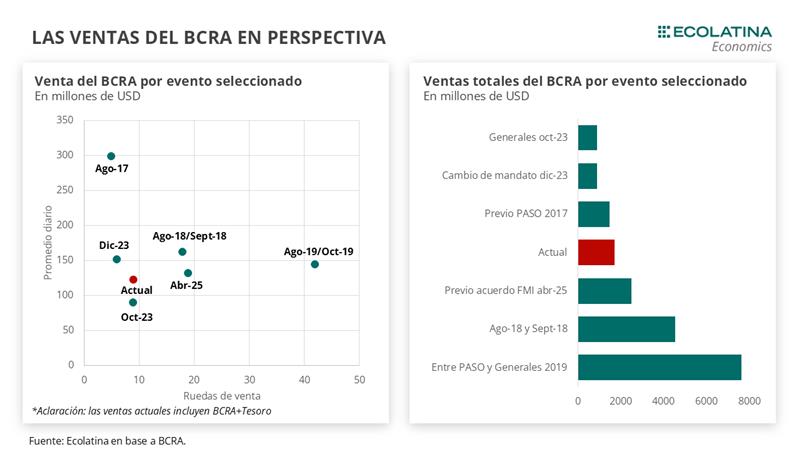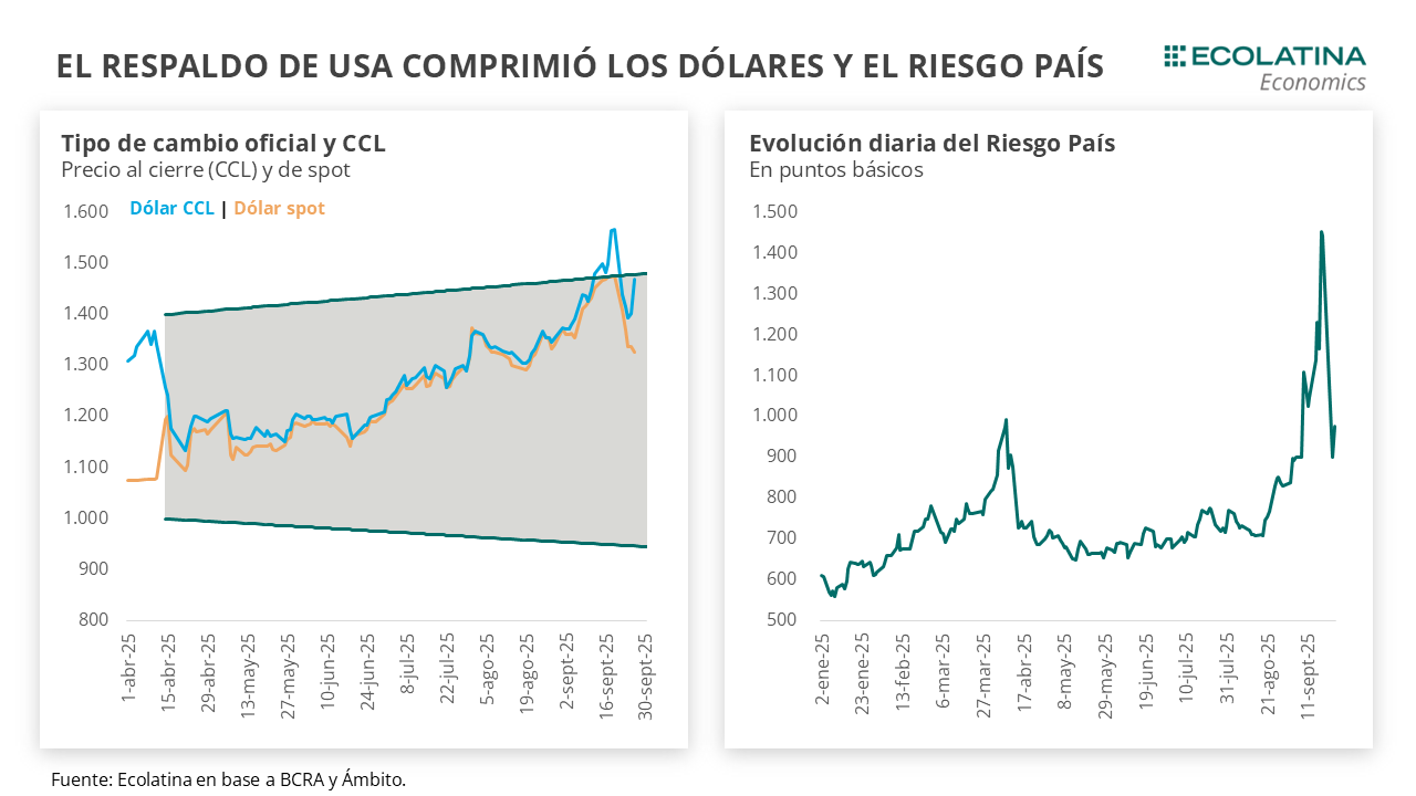 La semana estuvo caracterizado por la fuerte reacción del Gobierno para contener al dólar. Por un lado, el agro alcanzó el tope de liquidación por USD 7.000 M y finalizó la eliminación temporal de las retenciones, oferta extraordinaria que habría aprovechado el Tesoro para hacerse de USD en el mercado (confirmados USD 85 M el martes y cerca de USD 1.300 M el viernes, según trascendidos a la prensa). Por otro lado, el contundente apoyo financiero (y político) del Gobierno de USA, con el anuncio del Tesoro norteamericano de estar preparados para comprar bonos argentinos, otorgar un crédito stand-by y negociar una línea de SWAP por USD 20.000 M.