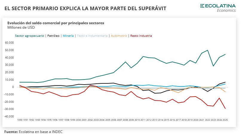 Al interior de este resultado, es posible observar que el resultado superavitario proviene del sector primario. Por caso, el sector agropecuario (incluido también a la industria de alimentos y bebidas) mostró un saldo superavitario por USD 44.333 M en 2025, ubicándose levemente por encima del promedio pos-pandemia (en torno a los USD 41.000 M entre 2021-2025).