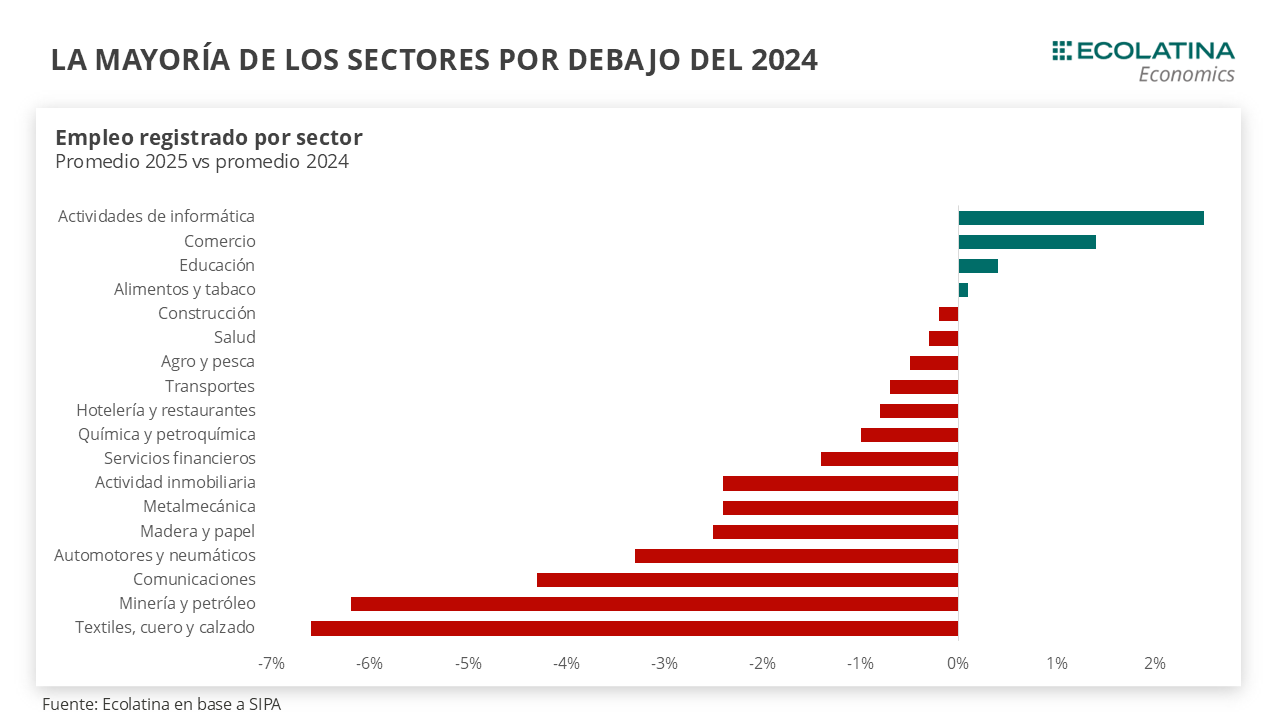 En términos agregados, la caída del empleo fue más pronunciada en los sectores productores de bienes (-1,4%) que en los servicios (sin variaciones) al analizar el promedio del 2025 contra 2024. No obstante, al interior de estos últimos también se observan retrocesos en varias actividades, como transporte (-0,7%), hotelería y restaurantes (-0,8%), servicios financieros (-1,4%), actividades inmobiliarias (-2,4%) y comunicaciones (-4,3%). Asimismo, la actividad que más puestos de trabajo privados creó fue la de servicios informáticos, con un incremento de 2,7% en el promedio anual.