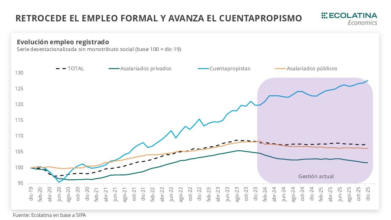 Sin embargo, el crecimiento del cuentapropismo dentro del empleo registrado no es un fenómeno puntual de 2025 -ni caracteristico del modelo economico-, sino una tendencia que se observa desde hace ya algunos años y se aceleró en la pospandemia. Desde entonces, este segmento creció alrededor de 25%. Lo distintivo es que, a diferencia de entonces, en los ultimos dos años se sumó la caída del empleo asalariado -tanto en el sector privado como en el público-, intensificando el cambio en la composición del empleo registrado.