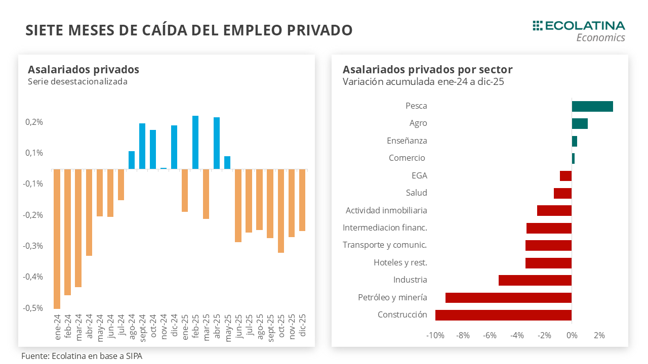 El empleo registrado creció 0,1% mensual en diciembre, manteniéndose en niveles similares a los de diciembre de 2024, según datos del Sistema Integrado Previsional Argentino (SIPA). El empleo privado asalariado (que representa cerca del 50% del total y constituye el segmento de mayor formalidad) cayó 0,2% s.e. en diciembre, acumulando siete meses consecutivos de retroceso, acumulando una pérdida de 96,8 mil puestos de trabajo. Sumando al empleo público, la perdida alcanza a 100,6 mil puestos en este período de tiempo.