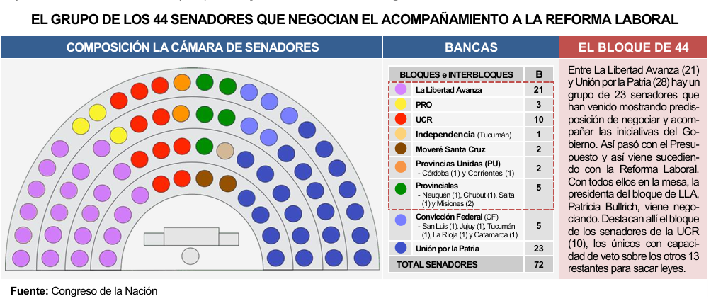 La situación es la siguiente: se sabe que la Reforma Laboral saldrá sancionada del Congreso, lo que falta saber es qué tipo de reforma saldrá. La forma final dependerá de la capacidad de presión de los Gobernadores para compensar (o eliminar) lo que la iniciativa les hace perder de recursos coparticipables y la capacidad que tenga el sindicalismo de convencer a los legisladores de no apoyar los componentes resistidos. Desde el oficialismo dicen que los cambios al proyecto oficial serán menores y que evalúan compensaciones para las provincias, pero que serán otorgadas por fuera de la ley y según cómo voten los legisladores, agregan. Esto no convence a los Gobernadores que por ahora retacean apoyo al no ver con claridad la compensación y podría reunirse en el Consejo Federal de Inversiones (CFI). Si hay rechazo masivo de gobernadores, la discusión estará trabada.