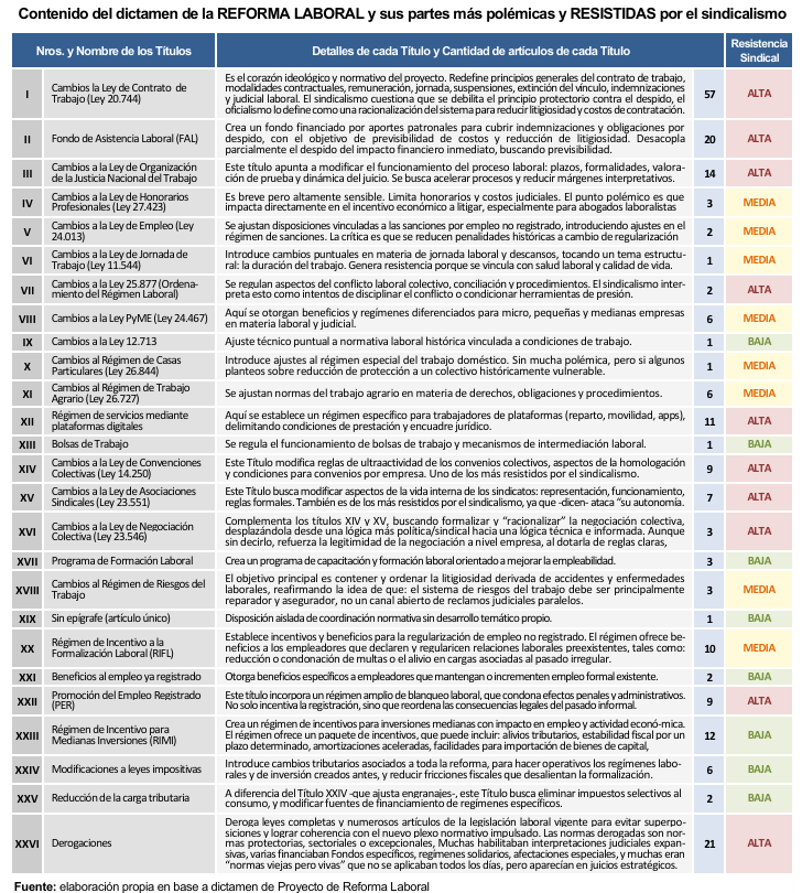 Por su parte, el sindicalismo evalúa diferentes recursos de presión sobre los legisladores. Saben que pueden contar con los 28 votos del peronismo (de sus dos sub bloques), pero necesitan juntar 9 votos más para lograr los 37 que necesitan para bloquear los componentes más resistidos. La dificultad para el sindicalismo, es que lo que negocian los gobernadores es el capítulo impositivo que incluye rebajas de impuesto para crear empleo, que no es particularmente el componente más resistido por los gremios. Aquí un mapa del dictamen de la Reforma y los Títulos que el sindicalismo más resiste y quisiera bloquear en el Congreso.