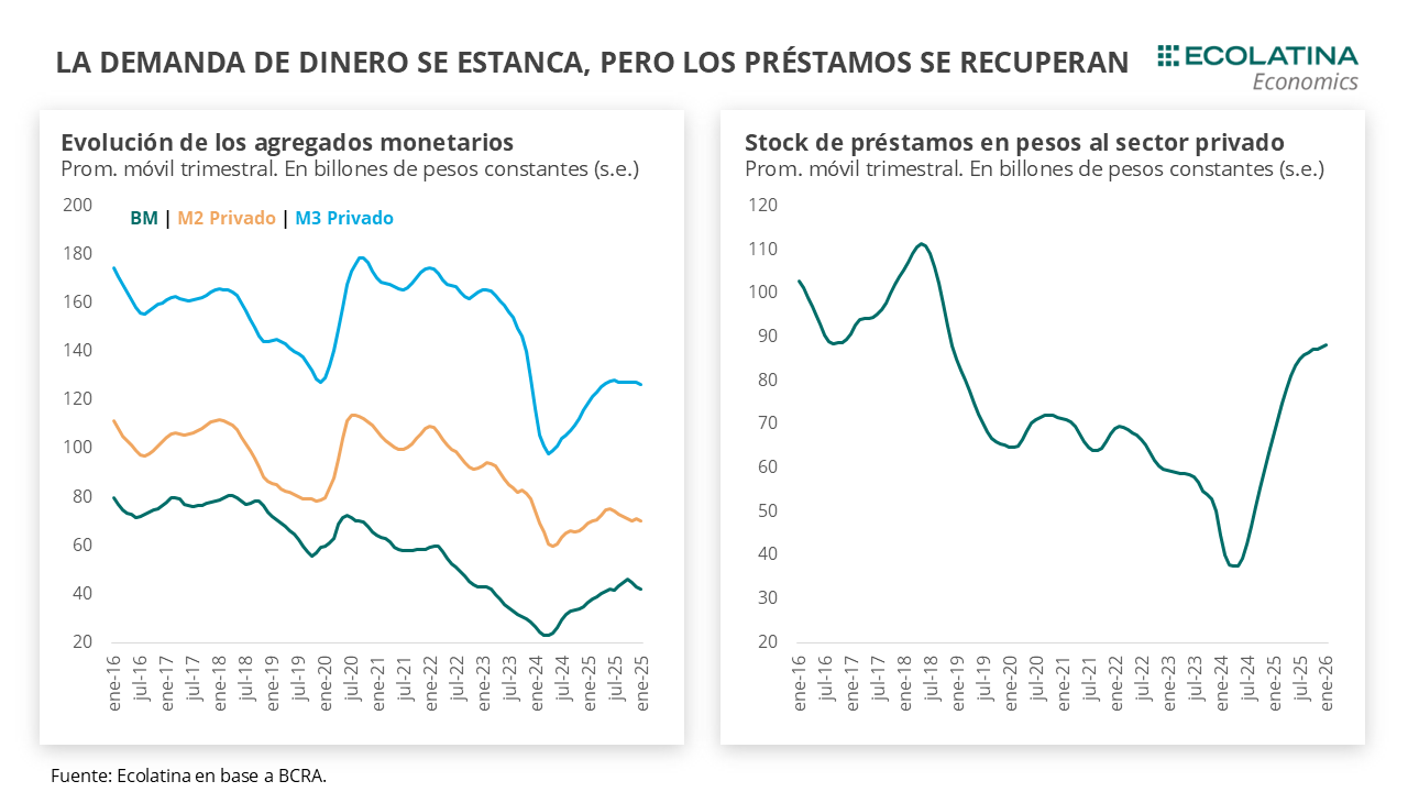 Reflejando este hecho, los diferentes agregados monetarios (proxy de la demanda dinero) cayeron durante el mes pasado. El M2 Privado Transaccional (circulante + depósitos no remunerados), medición que utiliza el BCRA para aproximar la demanda de dinero y que estima crecería 0,6 p.p. con relación al PIB en 2026, cayó a 1,0% mensual sin estacionalidad, el M2 Privado (circulante + depósitos sin excluir remunerados) se desplomó 5,2% s.e. y el M3 Privado (M2 + plazos fijos) bajó 1,6% s.e.