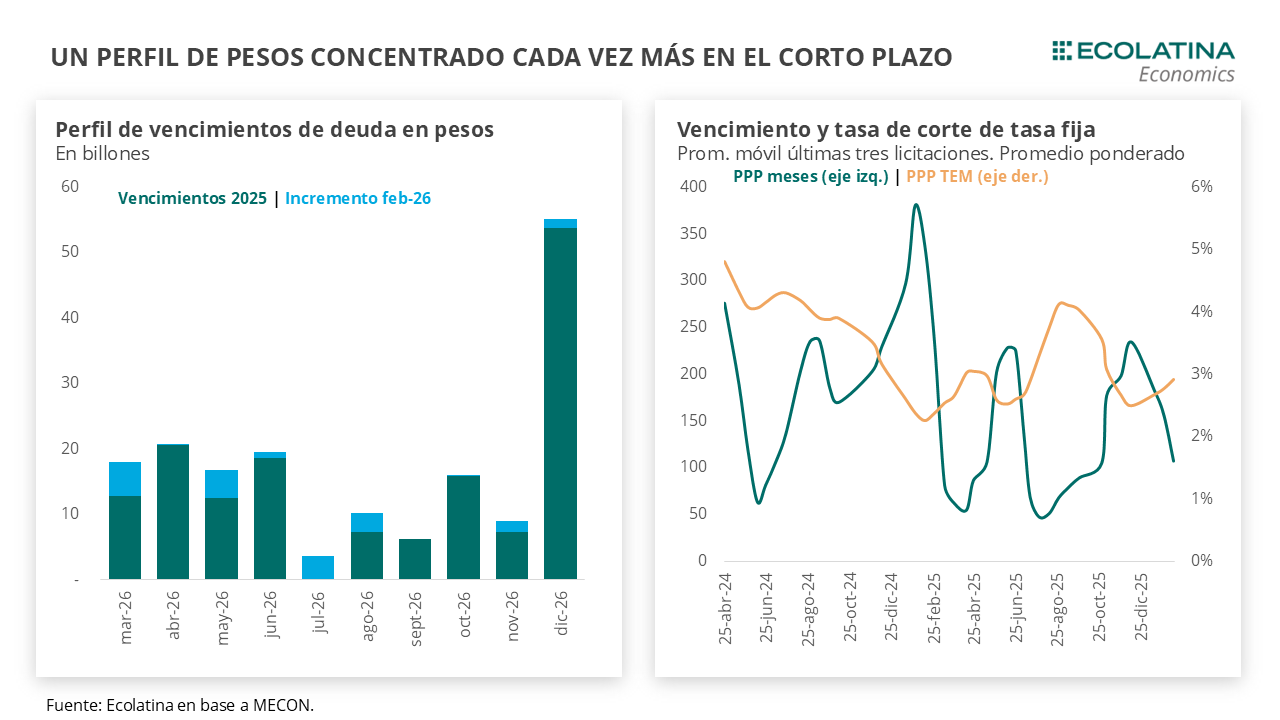 Otro factor a considerar es la suerte de “dominancia monetaria” que presenta el curso de la estrategia actual. Si los pesos emitidos por el BCRA como contrapartida de la compra de divisas son retirados vía bonos (venta en el secundario por el BCRA y licitaciones de Finanzas), esto implica un perfil de vencimientos en pesos del Tesoro creciente. Veamos en números. Tomando la última licitación y comparando con el perfil en pesos de diciembre del 2025, los vencimientos aumentaron $20,2 bn hasta finales de año y $53,5 bn hasta junio del 2027, previo a las elecciones presidenciales que tendrán lugar dicho año. Asimismo, si bien el premio de las licitaciones viene bajando, el perfil de vencimiento de los instrumentos a tasa fija sigue concentrándose mayormente en el corto plazo. El plazo promedio ponderado se acerca a los cuatro meses en lo que va del año, por debajo de los cerca de ocho meses que mostró en las últimas tres licitaciones de finales de 2025.