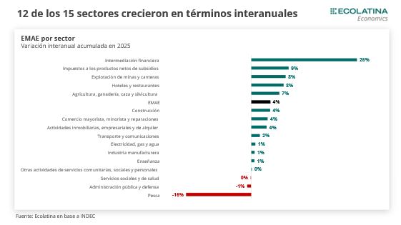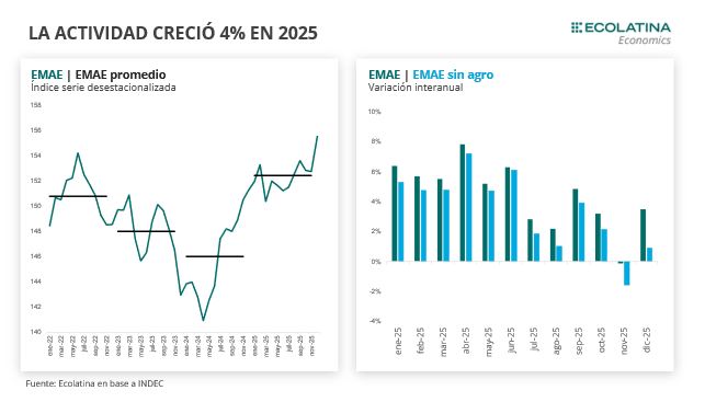 El Estimador Mensual de Actividad Económica (EMAE) mostró un crecimiento de 3,5% i.a. en diciembre y acumuló una suba de 4,4% i.a. en el año. Al interior, el sector agropecuario subió un 32,2% i.a. en diciembre (+6,5% i.a. en el año), por lo que el crecimiento interanual del EMAE sin agro se ubicó en 0,9% i.a. en el último mes del año y 3,3% i.a. en el promedio del 2025.
