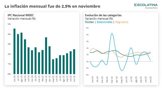 El IPC Nacional de INDEC trepó 2,5% mensual en noviembre, acelerándose 0,2 p.p. respecto al dato de octubre y acumulando cuatro meses consecutivos de aceleración. De esta forma, la inflación fue de 27,9% hasta noviembre y la variación interanual se ubicó en 31,4% i.a.