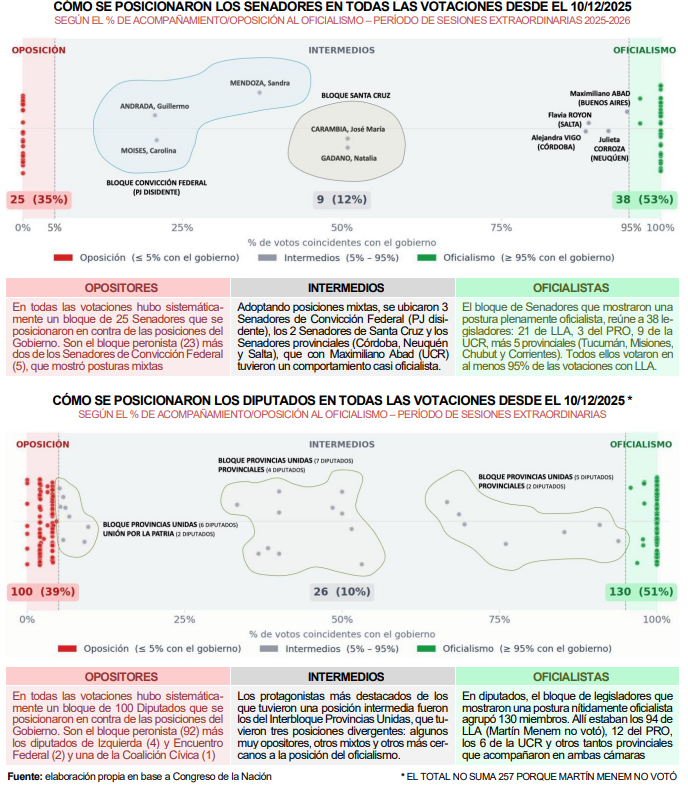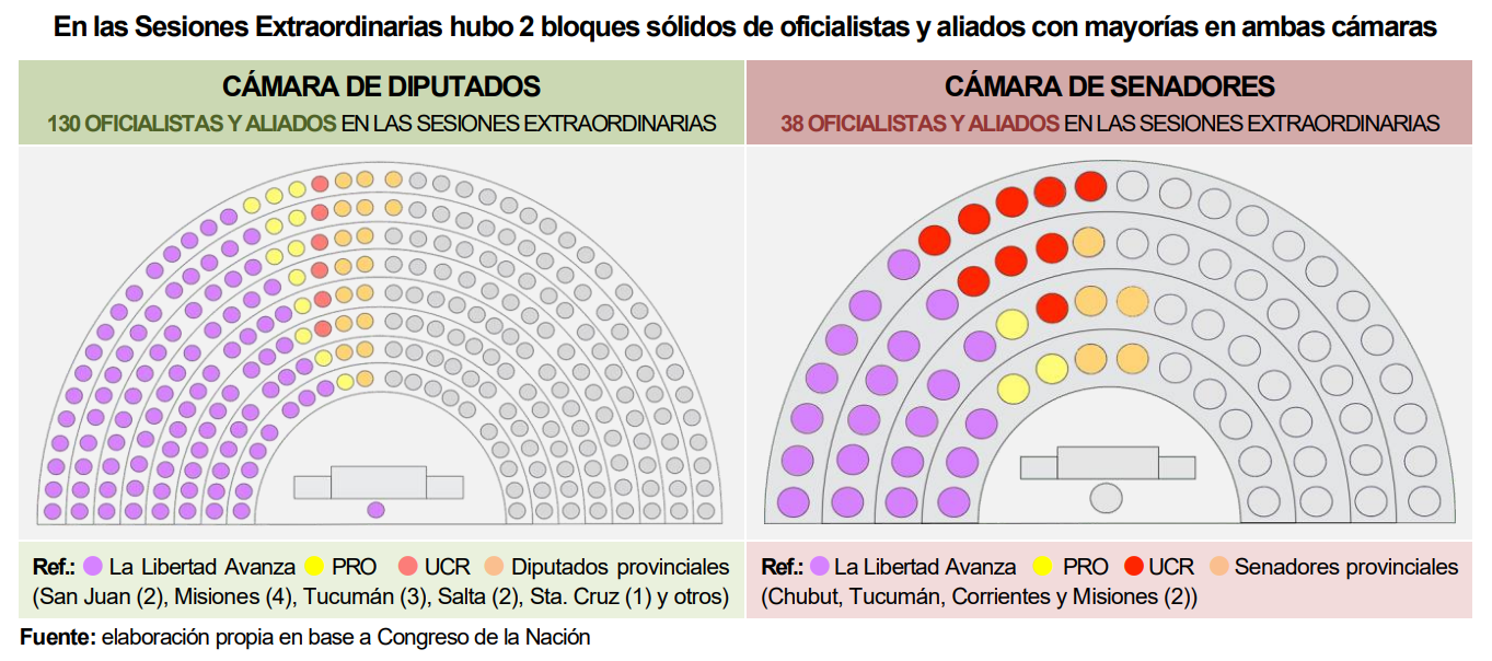 El panorama que mostraron las sesiones extraordinarias 2025-2026 fue muy auspicioso para el oficialismo. Milei contó con 130 diputados y 38 Senadores que votaron en más de un 95% con el oficialismo, en las más de 50 votaciones que hubo en ambas cámaras. Se trata de dos bloques de legisladores integrados por los propios de La Libertad Avanza, los afines del PRO y de la UCR y los negociadores de fuerzas provinciales. Entre todos ellos, se construyó la hegemonía legislativa que mostró el oficialismo para aprobar casi todo el temario de extraordinarias (solo faltó la media sanción final de la modificación a la ley de glaciares.