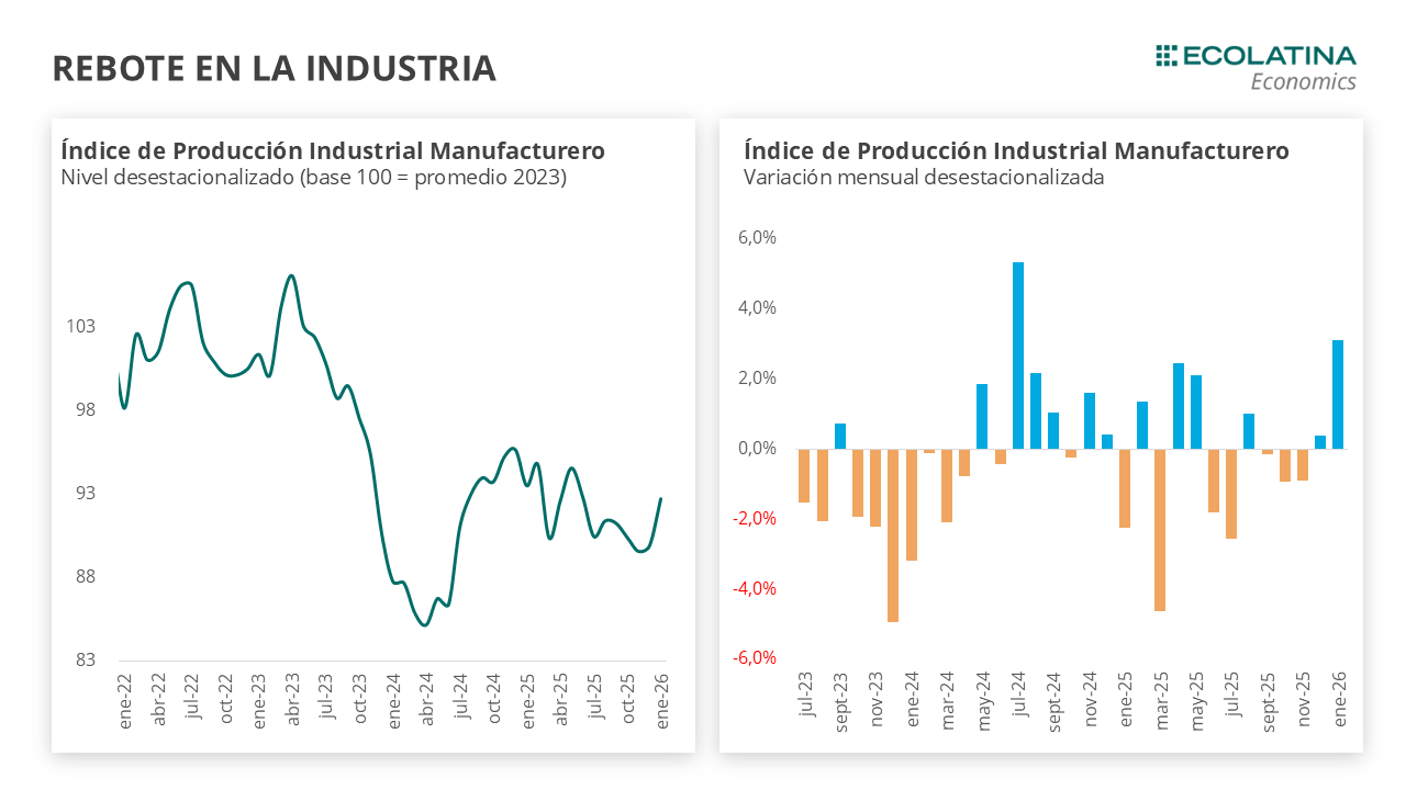 Si bien el dato de la industria sorprendió al alza, no debería representar un cambio relevante en la tendencia divergente observada en los últimos meses del 2025. Esto es, mientras la industria parece estar atravesando cambios de carácter más estructural, la construcción muestra una recuperación gradual, con vaivenes.