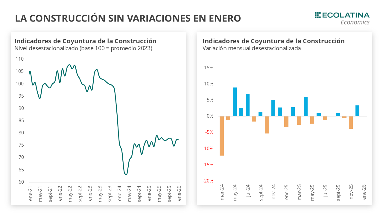 El Indicador Sintético de la Actividad de la Construcción (ISAC) se mantuvo sin variaciones en enero, luego de haber repuntado 3,4% en diciembre. De este modo, con el dato de enero la actividad se ubicó 1,2% por encima de igual mes del año pasado y 0,5% por encima del promedio de 2025.