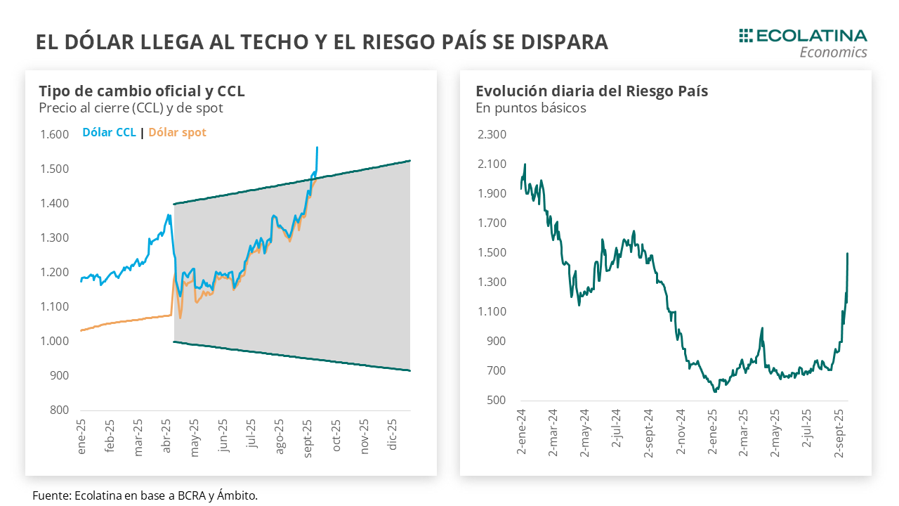 Como consecuencia, el BCRA vendió divisas por primera vez en el techo de la banda. Desde el miércoles, la autoridad monetaria vendió de forma creciente divisas en el mercado para defender la banda superior. Con depósitos del Tesoro en USD que lucen agotados, la principal herramienta para contener el techo la posee la autoridad monetaria con unas Reservas Líquidas robustecidas tras el acuerdo con el FMI. El riesgo que emerge de dicha estrategia es una circulo vicioso, donde a más ventas, más dudas del mercado sobre su sostenibilidad, retroalimentando y produciendo mayores ventas. En este marco, el riesgo país escaló hasta romper la barrera de los 1.500 puntos, reduciendo la probabilidad de un ingreso rápido a los mercados internacionales en 2026.