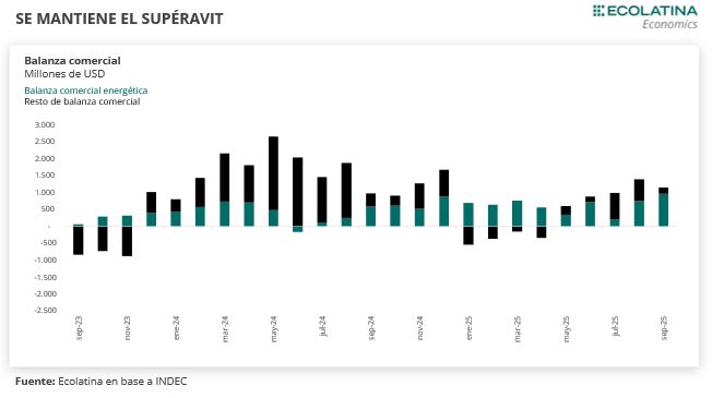 Al interior, la balanza comercial energética nuevamente explicó la mayor parte del superávit: las exportaciones fueron USD 967 M, mientras que las importaciones fueron de USD 191 M. De esta manera, el saldo comercial fue de USD 776 M en el mes, acumulando USD 5.367 M hasta el noveno mes del año, con exportaciones con un acumulado de USD 8.129 M, mientras que las importaciones fueron de USD 2.763 M hasta septiembre.