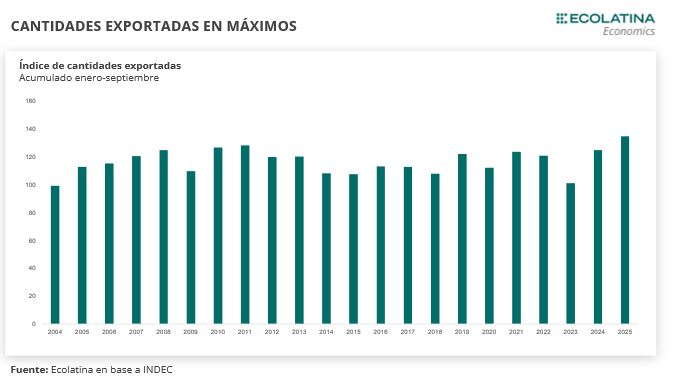 La mejora se explicó por una aceleración tanto en las exportaciones como en las importaciones. Por un lado, las exportaciones fueron USD 8.128 M en el mes de septiembre, exhibiendo una suba de 16,9% i.a. Además, mostraron un crecimiento mensual de 1,3% en términos desestacionalizados y una suba de 16,5% i.a. en las cantidades exportadas (con precios con una leve suba de 0,3% i.a.). En esta línea, cabe destacar que las cantidades de las compras externas se encuentran en niveles máximos de las últimas décadas al observar el acumulado de enero-septiembre.